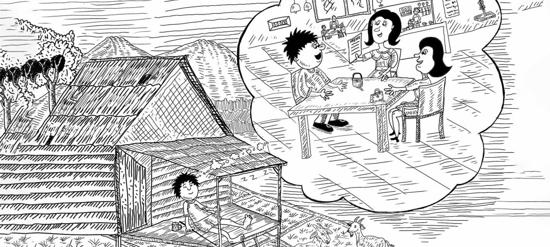 Dalam keheningan, Paijo terbuai oleh semilir angin di pematang sawah itu. Paijo tidak kuat lagi melawan kantuk sehingga ia tertidur nyenyak sambil memegang kayu di tangannya.  Dalam tidurnya ia bermimpi ketemu Menik dan Yanti di sebuah kota. Paijo pun diajak untuk ngopi atau ngeteh bersama.