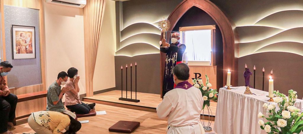 [KATEDRAL] Tenang, khidmat, dan nyaman mungkin ketiga kata ini adalah pilihan yang pas untuk menggambarkan suasana ruang adorasi di Paroki BMV Katedral Bogor yang baru saja diresmikan dan diberkati. Ruang yang didominasi warna coklat pada dinding dan hampir seluruh perabotan membangkitkan kesan nyaman. Cahaya remang-remang yang muncul malu-malu dari sela-sela bangunan seakan menjadi pemanis yang nirmala untuk melengkapi Ruang Adorasi St. Yosef yang terletak di lantai 2 Gedung Santa Maria.